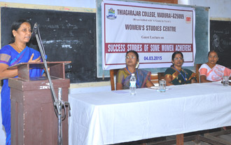 A guest lecture on “Success Stories of Some Women Achievers” was arranged by Women’s Studies Centre on 04.03.2015. The Director of Women’s Studies Centre, Dr. M. Eyini, welcomed the gathering. The invited speaker Dr. N. Manimegalai, Director, Women’s Studies Centre, Bharathidasan University, Trichy motivated the students by telling them the success stories of some women achievers from the lower strata of the society and from the general public. She traced their path of success and detailed how they could emerge as successful women by breaking the glass ceilings over their heads to reach to the top. She advised the women students to develop their skills and to use them efficiently in order to succeed.