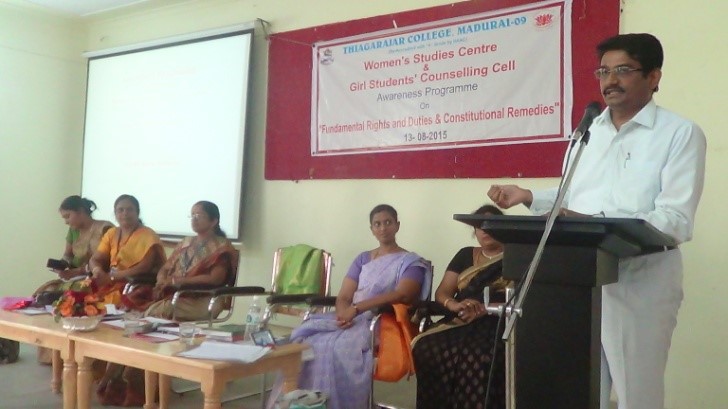 Women’s Studies Centre and Girls Students’ Counselling Cell jointly organised an awareness programme in association with the National Legal Rights Protection Council (NLPC) on Fundamental Rights and Duties & Constitutional Remedies. Dr. A. Suganthi welcomed the gathering. Dr.M.Eyini, Principal, in her presidential address emphasised the need for moulding students as responsible citizens and to equip them with knowledge pertaining to the Laws pertaining to them. Thiru. K.Samidurai, Advocate Madras High Court (Madurai bench) addressed the students on various problems encountered due to Law illiteracy. Mrs.Raji Vishwanath, Women’s Wing Director, NLPC, Madurai educated the students on internet security. All the outgoing students benefited out of this Programme.