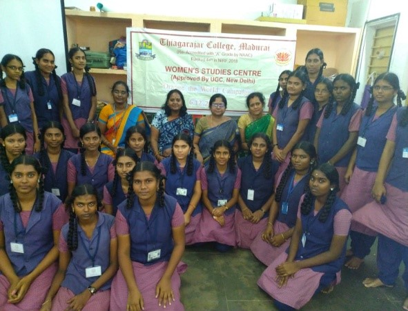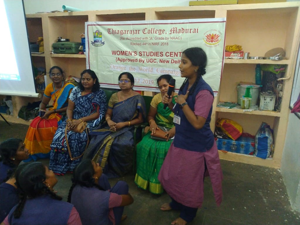 Violence Against Women and girls is one of the most wide spread, persistent and devastating human rights violations in our world today and a threat to millions of girls and women, offline and online. The Women’s Studies Centre at Thiagarajar College organized “Orange the World Campaign” as an Extension Programme at Sri Meenakshi Sundareswarar Govt Girls High School, Teppakulam, Madurai. Dr. V. Subathra Devi, Director, Women’s Studies Centre, addressed the students and highlighted the colour orange symbolizing a bright future, free of violence. She explained how women and girls are affected regardless of their age, background, or level of education. This violence takes many forms, including physical, sexual or psychological violence, as well as economic abuse and exploitation. Dr. I. Chitra, Coordinator, Women’s Studies Centre demonstrated the reason & causes of violence against women with a short film .