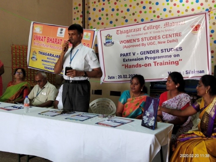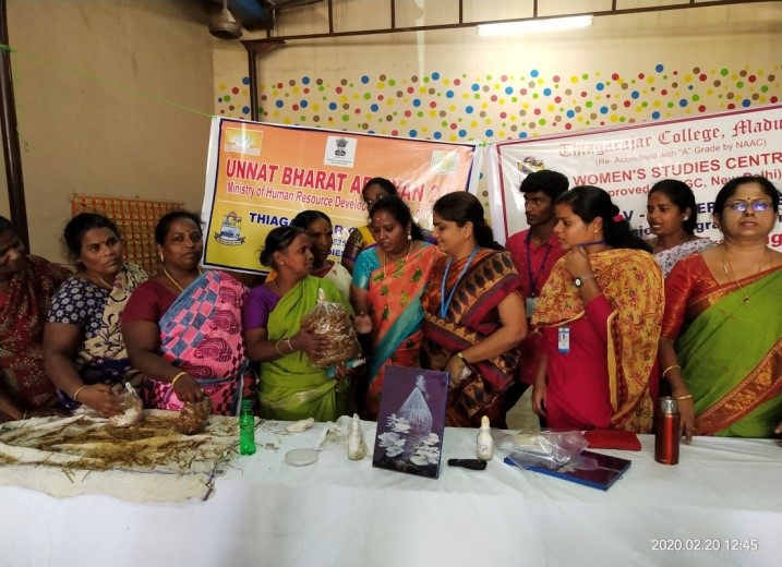 The Centre organized an extension programme on “Hands – on - Training” 20.02.2020.. Around 70 rural women of Silaiman village benefited out of this programme. Dr. V. Subathra Devi, Director, Women’s Studies Centre welcomed the gathering. Dr. D. Pandiaraja, Principal gave the presidential address. Mr. Shahul Hamid, Panchayat Union President of Silaiman Village delivered his felicitation. Dr. B. Sadhana, Assistant Professor of Botany, Thiagarajar College, demonstrated and offered a training of “Mushroom Cultivation” and Dr. S. Elamathi, Assistant Professor of Chemistry, Thiagarajar College, trained the rural women in “Making Fragrance Dhoop”. Healthy lunch was provided for the participants, who amply thanked the management and the Centre for the career enabling initiative.