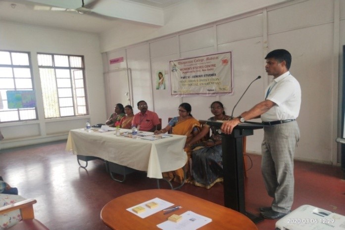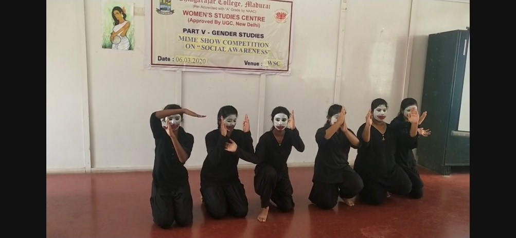 Women’s Studies Centre of Thiagarajar College organized a Mime Show on 06.03.2020 on the theme “Social Awareness”. The students, with multifaceted skills, portrayed in their language less performance, the ignorance of the society regarding the Government schemes such as Swach Bharath, Digital India, Beti Bachao Beti Padhao etc. They also expressed their silent protest against the subjugation of women in the patriarchal society. Their positive outlook on the society instilled a ray of hope among all the students. It was a team event and around 150 Part V – Gender Studies students of the college participated in the programme.