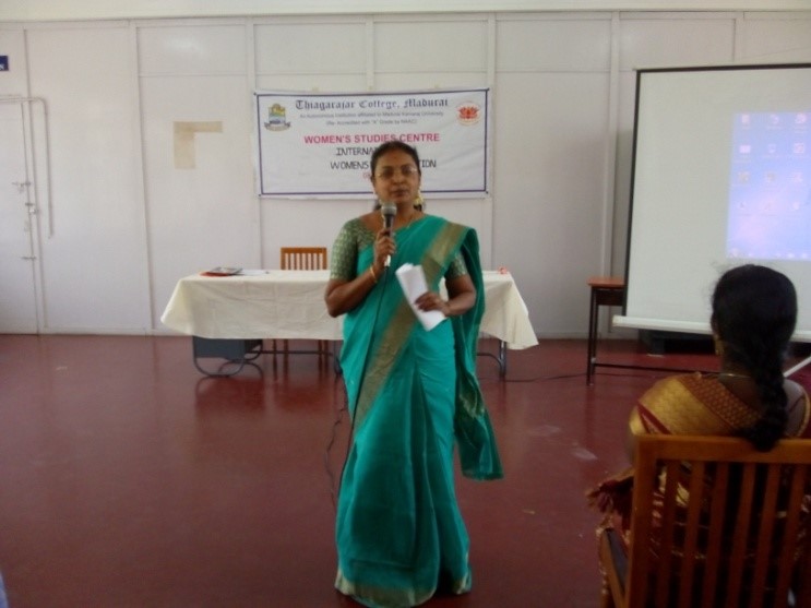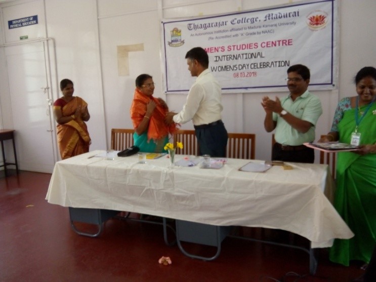 The Centre Celebrated the International Women’s day on 08.03.2018. Dr. D. Pandiaraja, Principal, Thiagarajar College, presided over the event. In his presidential address, he insisted on the inevitable importance of women. Dr. I. Chitra, co-ordinator, Women’s Studies Centre, welcomed the gathering and briefed the activities of the centre. In his special address, Dr. R. Srivnivasan, Dean - Students Welfare, emphasized that women should be like Bharathiyar’s “puthumai pen”. Dr. R. Angeline Chella Rajathi, Assistant Coordinator, Women’s Studies Centre introduced the guest of honour, Dr. N. K. Asha Devi, Associate Professor, Department of Zoology, Thiagarajar College. The guest of honour spoke about “You & Your identity”. Cultural events were conducted for the students as well.