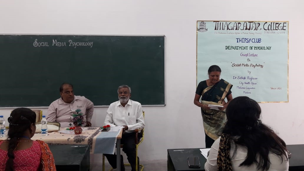 The Centre, in association with the Department of Psychology, Thiagarajar College, Madurai, organized a guest lecture on “Social Media Psychology” on 30.01.2019. Dr. D. Anbugeetha, Director, Women’s Studies Centre, welcomed the gathering and briefed the importance and the objective of the programme. Dr. T. Rajasekar, Director, Self Financed courses, inaugurated the programme. Dr. D. Pandiaraja, Principal gave the presidential address. Dr. Sathish Raghavan, City Health Officer, Madurai Corporation, Madurai, delivered the key note address. He traced the evolution of the various social media and the indelible impact they have on the vulnerable minds of the students. He cautioned the students to use the social media with discretion and avoid spending too much of their valuable time over the media. In the interactive session that followed he answered the queries of the students. Mrs. N. Radhika, Assistant Professor of Psychology, proposed the vote of thanks.