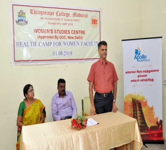 | Dr. D. PANDIARAJA, PRINCIPAL DELIVERING PRESIDENTIAL ADDRESS IN THE MEDICAL CAMPs FOR WOMEN FACULTY. |