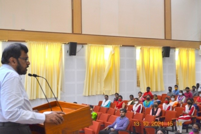 The Women’s Studies Centre of Thiagarajar College organized an onstage lecture on the need of the hour, Post Pandemic mental Health on 13.10.2021. Dr. C. Ramasubramanian MBBS., DPM., MD., Psychiatrist, Founder – M.S. Chellamuthu Trust, Research Foundation, State Nodal Police officer Well- Being Programme, delivered the key note address for about 45 minutes. He spoke about the depressing health condition that prevailed in the society during the pandemic and the medical emergency handled meticulously by the frontline warriors, doctors and nurses. He requested the students to stay confident and resilient in saving themselves from the various physical and mental health issues.
