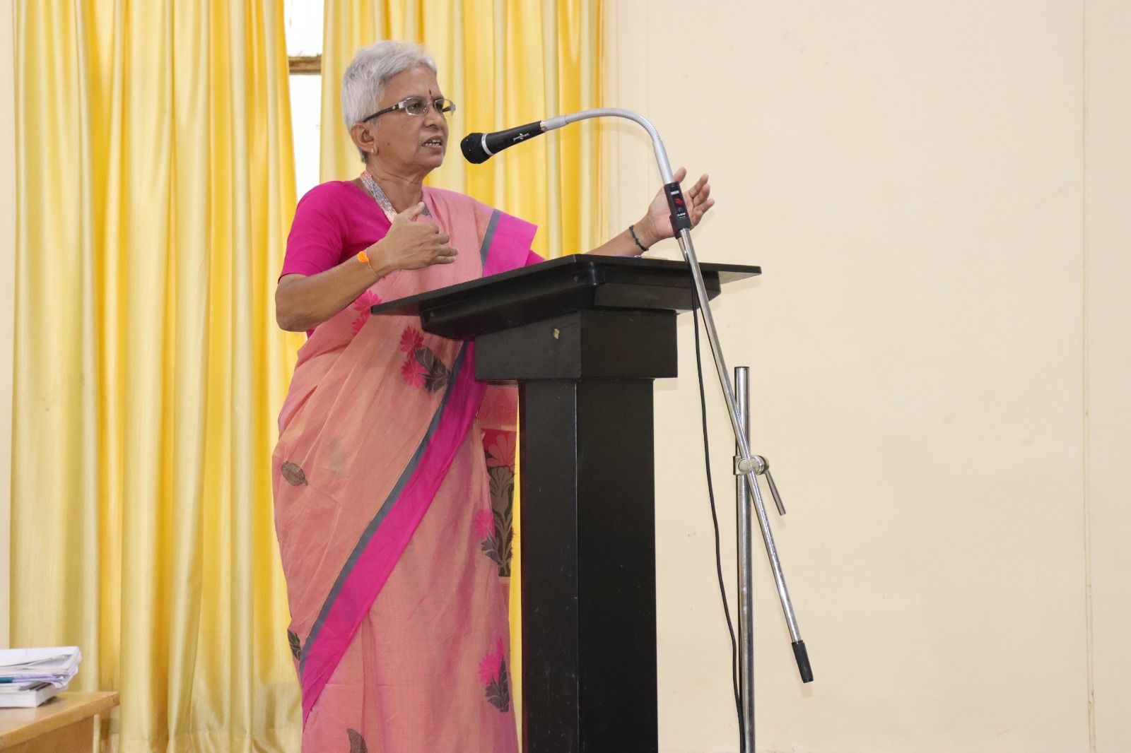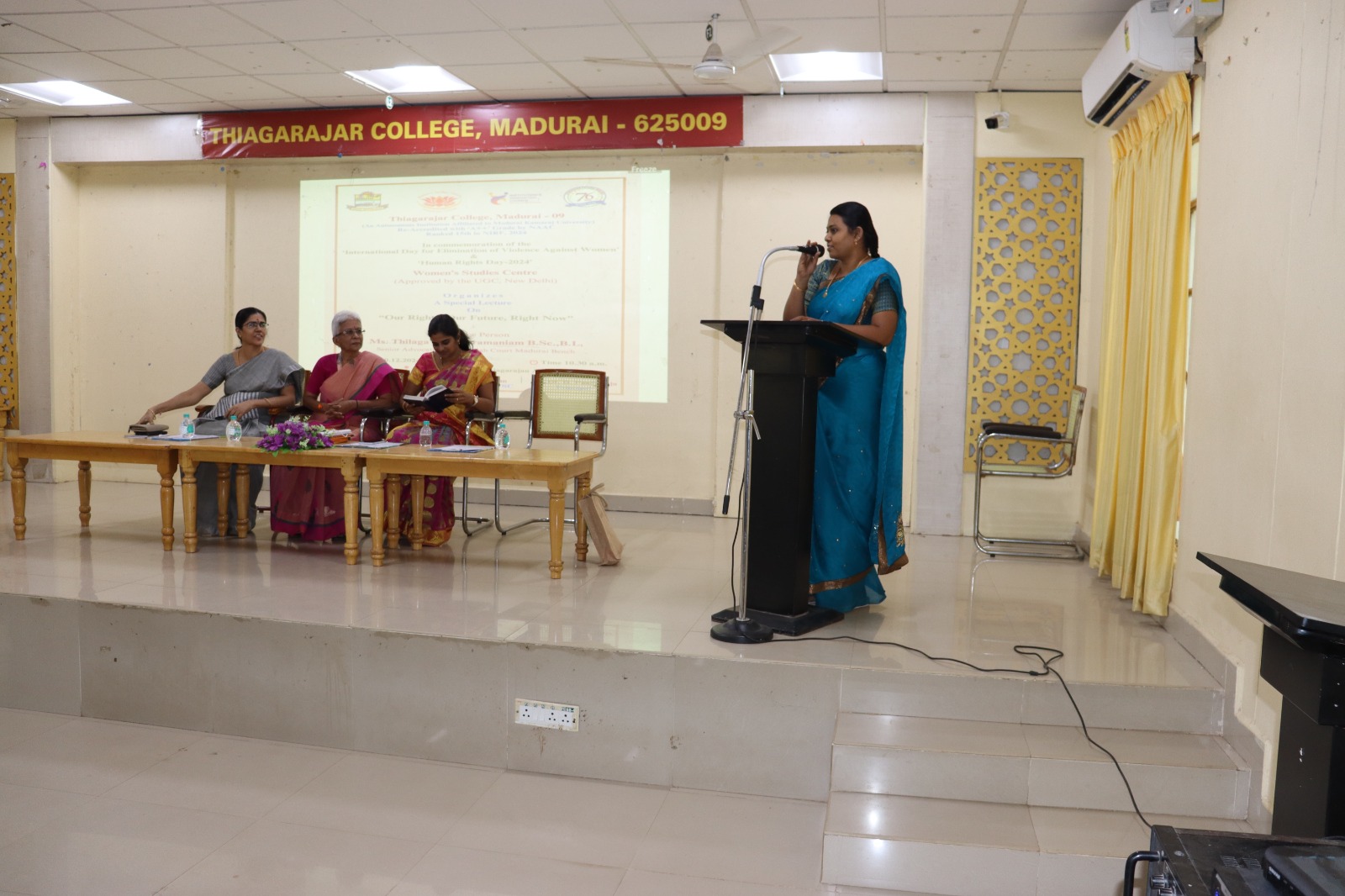 In commemoration of the International Day for the Elimination of Violence Against Women and Human Rights Day - 2024, the Women's Studies Centre organized a special lecture titled "Our Rights, Our Future, Right Now." Mrs. R. Sribala, Director, WSC welcomed the gathering and explained the purpose of the event which aimed to raise awareness about various forms of violence and the importance of upholding human rights.