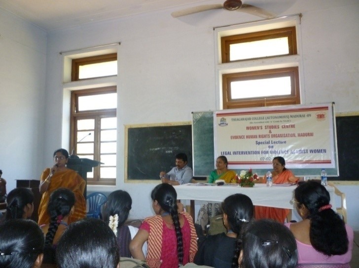 Thiagarajar College Women’s Studies Centre and Evidence Human Rights Organisation, Madurai jointly organised a seminar on “Legal intervention for Violence Against Women” on 07.02.2014. Though the Central government enacts laws and makes amendments to the existing ones to prevent violence against women, none of them is being implemented properly in the country, claimed A. Kathir, Executive Director, Evidence, an NGO working for human rights. Addressing the students of Thiagarajar College during the seminar, Mr.Kathir said though the Criminal Law (Amendment) Act, 2013, based on the guidelines of the J.S. Verma Committee provided for the trial of rape cases in fast track courts to deliver justice for rape victims, it was not properly implemented. He also pointed out that incidents of rape were on the rise in India. Many may claim that the increase in the number was because more victims were coming forward to lodge complaints. However, he said, even in cases taken up legally, the victims were not getting justice. There were 150 participants in the seminar, mostly girl students, who actively interacted with the organizers with many queries and views.